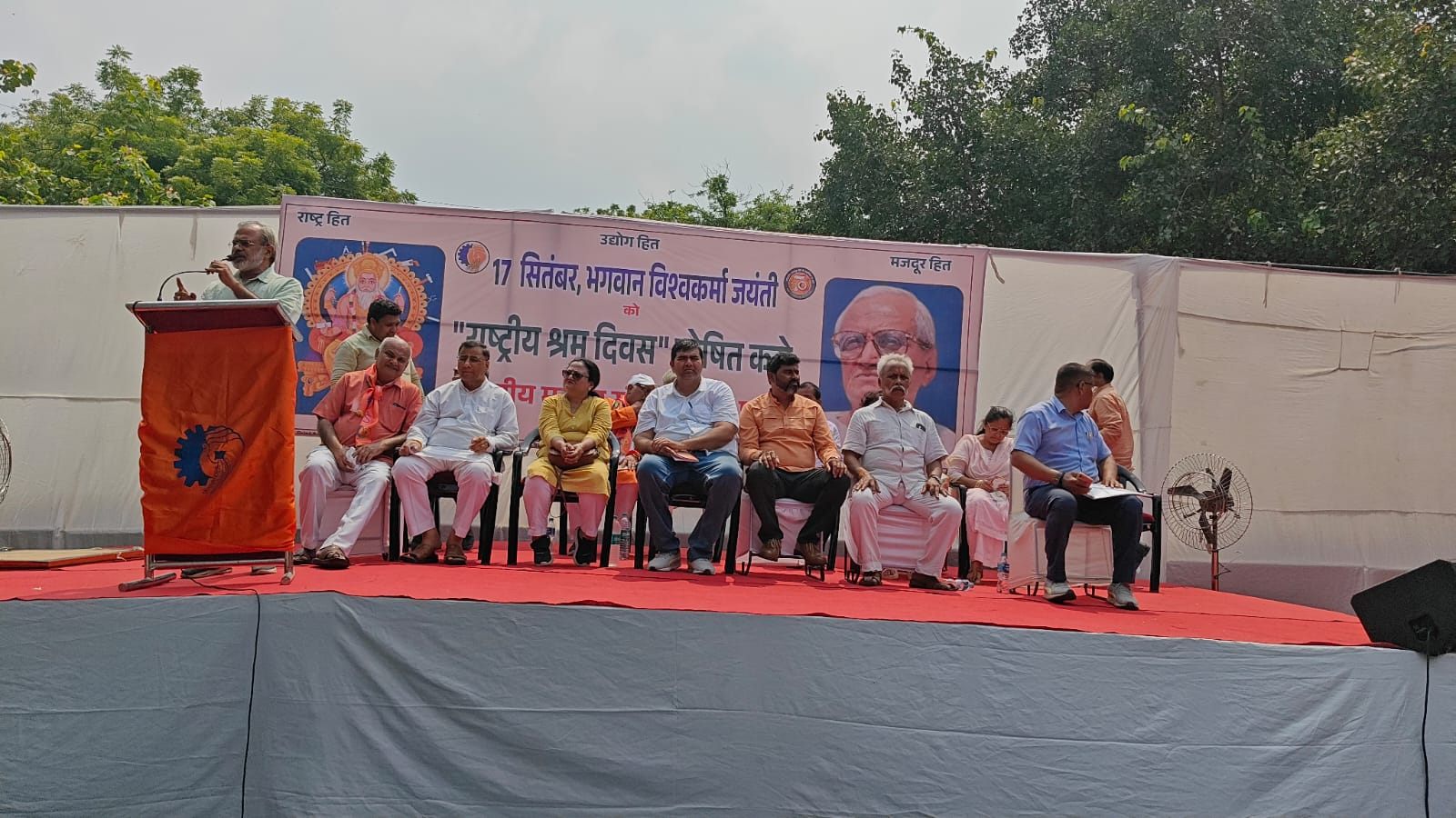 भारतीय मजदूर संघ ने जंतर- मंतर पर हजारों मजदूरों के साथ भगवान विश्वकर्मा जयंती मनाई, अध्यक्ष इंदु जामवाल ने विश्वकर्मा जयंती की सभी को शुभकामनाएं दी साथ ही दिल्ली सरकार से अपील की 17 सितम्बर का अन्य प्रदेशों की तरह अवकाश घोषित करे ताकि मजदूर अपने ईष्ट देव की पूजा अर्चना कर सके। भारतीय मजदूर संघ के महामंत्री डॉ दीपेंद्र चाहर ने दिल्ली परिवहन निगम सहित शिक्षा विभाग, विद्युत विभाग, जल बोर्ड, दिल्ली सचिवालय सहित सभी संविदाकर्मियों को तीन महीने में स्थाई करे दिल्ली सरकार, पड़ोसी राज्य हरियाणा एक लाख बीस हजार संविदा कर्मियों के लिए सेवा सुनिश्चितता बिल तहत अठावन साल तक स्थाई नौकरी , डी ए, बोनस सर्विस बुक, स्वास्थ्य सुविधा सहित सभी सुविधा उपलब्ध करा रही है इसी प्रकार दिल्ली नगर निगम, नई दिल्ली नगर पालिका परिषद , दिल्ली छावनी बोर्ड भारत सरकार, पब्लिक सेक्टर, प्राइवेट सेक्टर भी 5 साल से अधिक कार्य कर रहे सभी कॉन्ट्रैक्ट (संविदा कर्मी) को पक्की नौकरी देने की कार्यवाही की जानी चाहिए । पुरानी पेंशन बहाली, आश्रितों को नौकरी देने की माँग प्रमुखता से उठी।